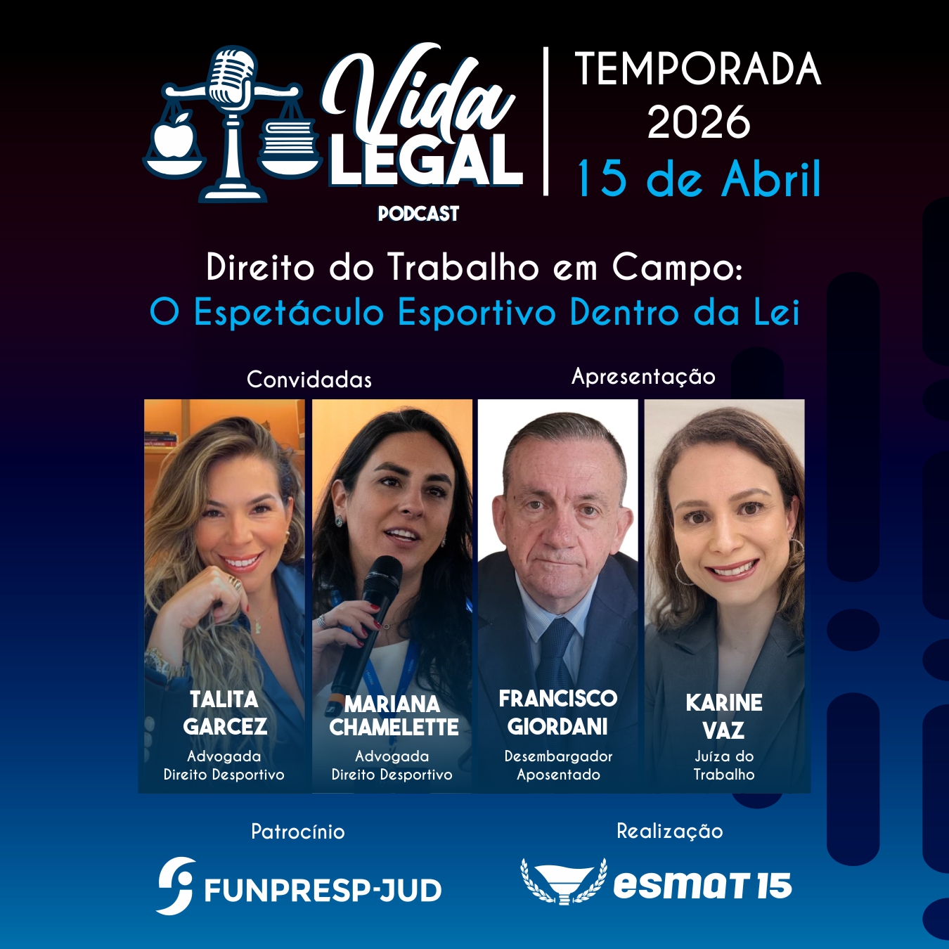 A 2ª temporada do Podcast VIDA LEGAL da ESMAT 15 estreia nesta quarta-feira, 15/04, com o tema: "Direito do Trabalho em Campo: O espetáculo esportivo dentro da Lei".