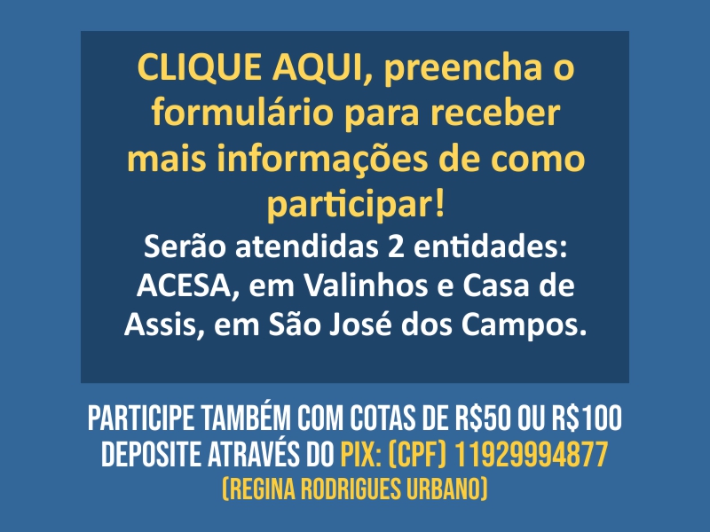 Caso não possa comprar e entregar o presente, ajude financeiramente com uma cota de R$100,00, através do PIX: (CPF) 11929994877 - Regina Rodrigues Urbano.