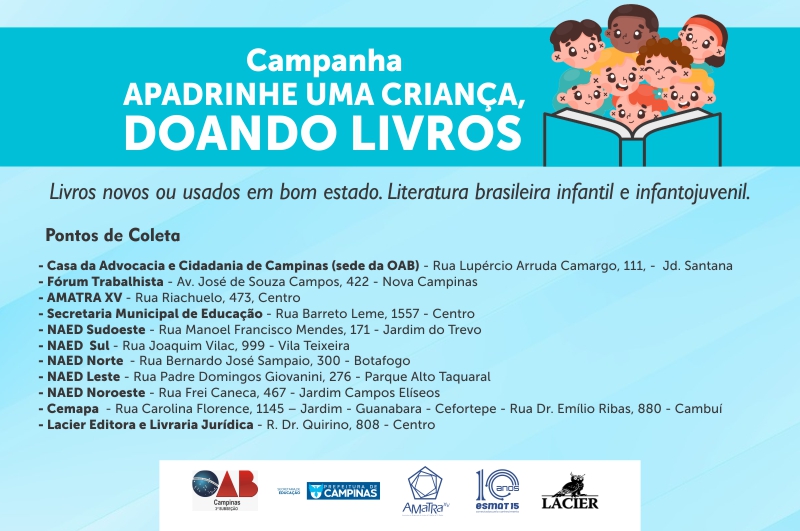 Na última quarta-feira, 26/10, aconteceu o lançamento da Campanha "Apadrinhe uma criança, doando livros". A iniciativa é da AMATRA XV e ESMAT 15, através da Diretora Cultural e de Cidadania da AMATRA XV, Desembargadora Tereza Aparecida Asta Gemignani, com a participação da Diretora Regional da Circunscrição de Campinas, Juíza Milena Casacio Ferreira Beraldo. O projeto também conta com a parceria da OAB Subseção Campinas, por meio da Presidente Luciana Freitas, e apoio do Secretário Municipal de Educação de Campinas, Professor José Tadeu Jorge, e da Editora e Livraria Lacier.