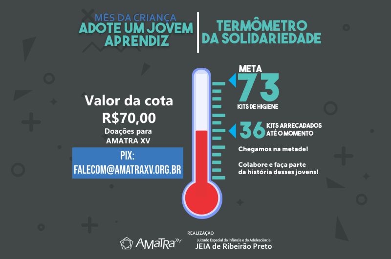 No mês da criança, a AMATRA XV abraça a campanha de arrecadação de kits de higiene pessoal do Juizado Especial da Infância e da Adolescência – JEIA de Ribeirão Preto. A ação idealizada pela Coordenadora do JEIA da região, Juíza Márcia Cristina Sampaio Mendes, visa beneficiar 73 jovens aprendizes em situação de vulnerabilidade social, atendidos pelo projeto “Aprendizes cidadãos”.