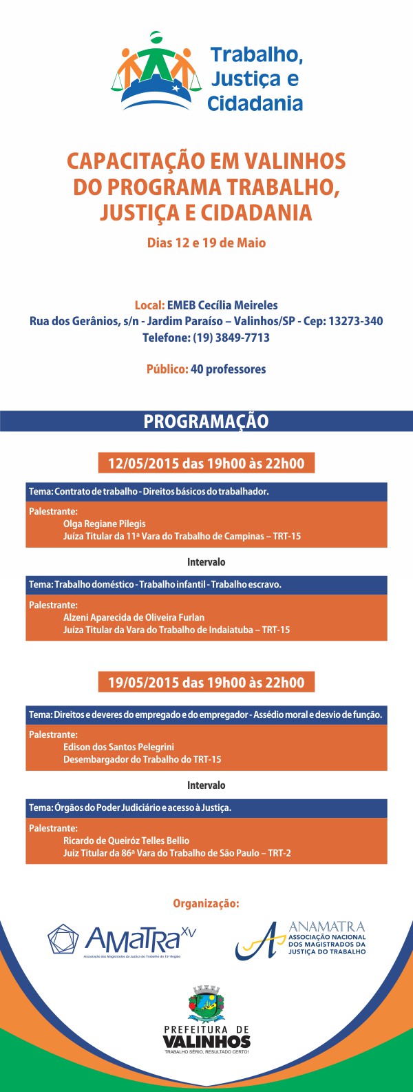 A AMATRA XV promove nos dias 12 e 19 de Maio, a partir das 19h, a Capacitação dos Professores na cidade de Valinhos do Programa Trabalho, Justiça e Cidadania (TJC). O evento será realizado na escola Emeb Cecília Meireles para 40 professores.
