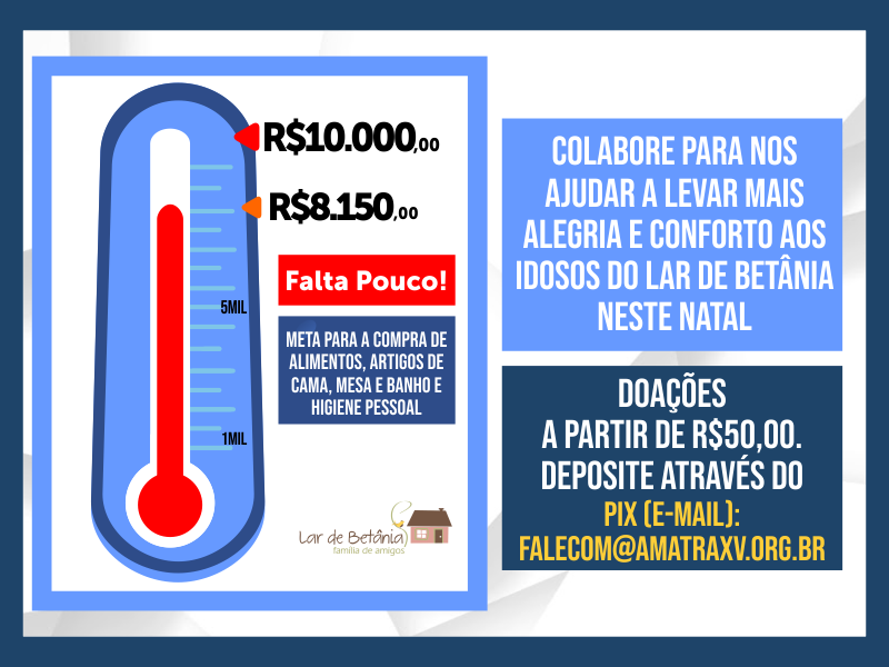 Participe da campanha adotando um idoso, faça a sua doação a partir R$50,00. Sua contribuição pode ser feita até o dia 17/12 (sexta-feira), através do PIX (e-mail):