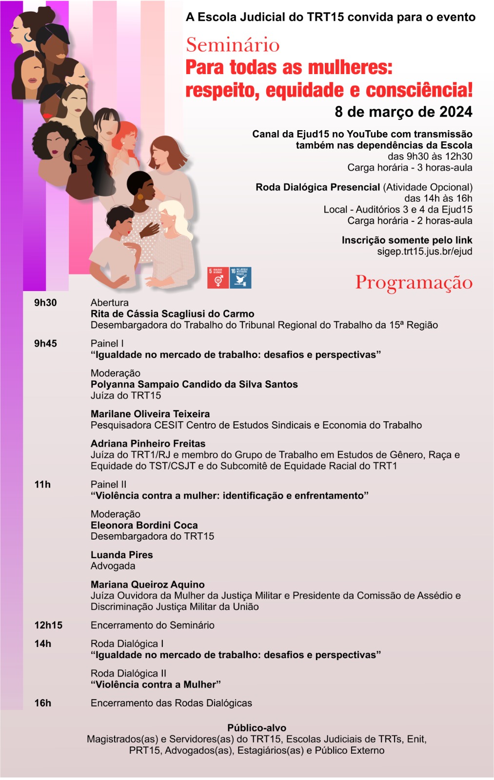 No dia 08/03 (sexta-feira), das 9h30 às 12h30, a Escola Judicial do TRT-15 realizará o Seminário: "Para todas as Mulheres: respeito, equidade e consciência!". A atividade é gratuita e aberta ao público.