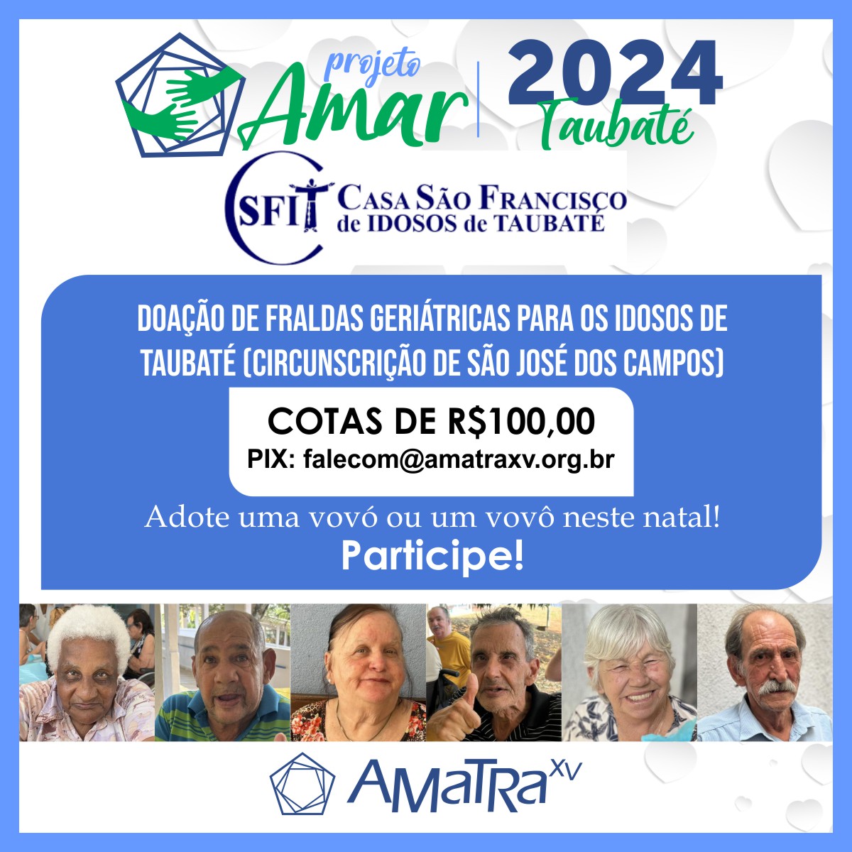 Este ano, o Projeto AMAR da AMATRA XV beneficiará 87 vovós e vovôs residentes na Casa São Francisco de Idosos de Taubaté (SP). A instituição de longa permanência abriga pessoas com idade entre 61 e 95 anos, sendo 45 senhoras e 42 senhores.