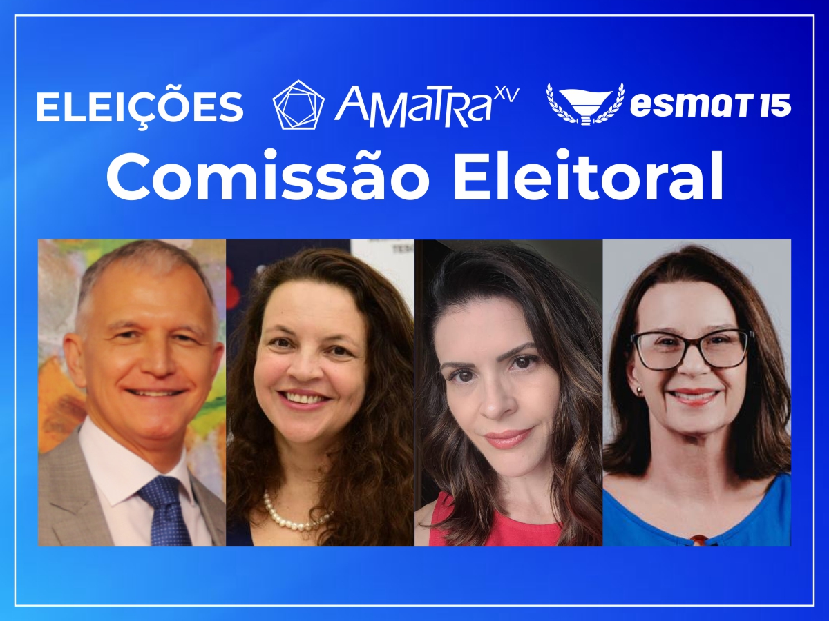 A Comissão Eleitoral é composta pelos Desembargadores Viviane Leite (AMATRA 5/BA) e Paulo Sérgio Pimenta (AMATRA 18/GO), além dos Juízes Carlos Alberto Pereira de Castro (AMATRA 12/SC), Gilberto Augusto Leitão (AMATRA 10/DF-TO) e Suzane Ribeiro (AMATRA 17/ES), e do Juiz Aposentado José Aparecido dos Santos (AMATRA 9/PR).