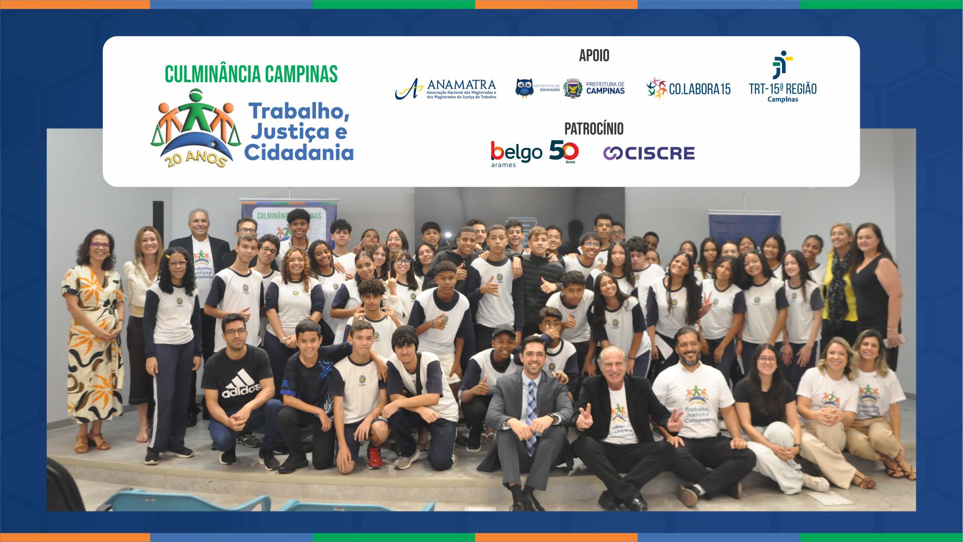 No dia 7 de novembro, a Coordenadoria Regional do Programa Trabalho, Justiça e Cidadania (TJC), no âmbito da AMATRA XV, realizou no espaço do Co.Labora 15, localizado na sede administrativa do TRT-15 em Campinas (SP), a programação de culminância com os alunos do 9º ano da Escola Municipal de Ensino Fundamental “Zeferino Vaz”.