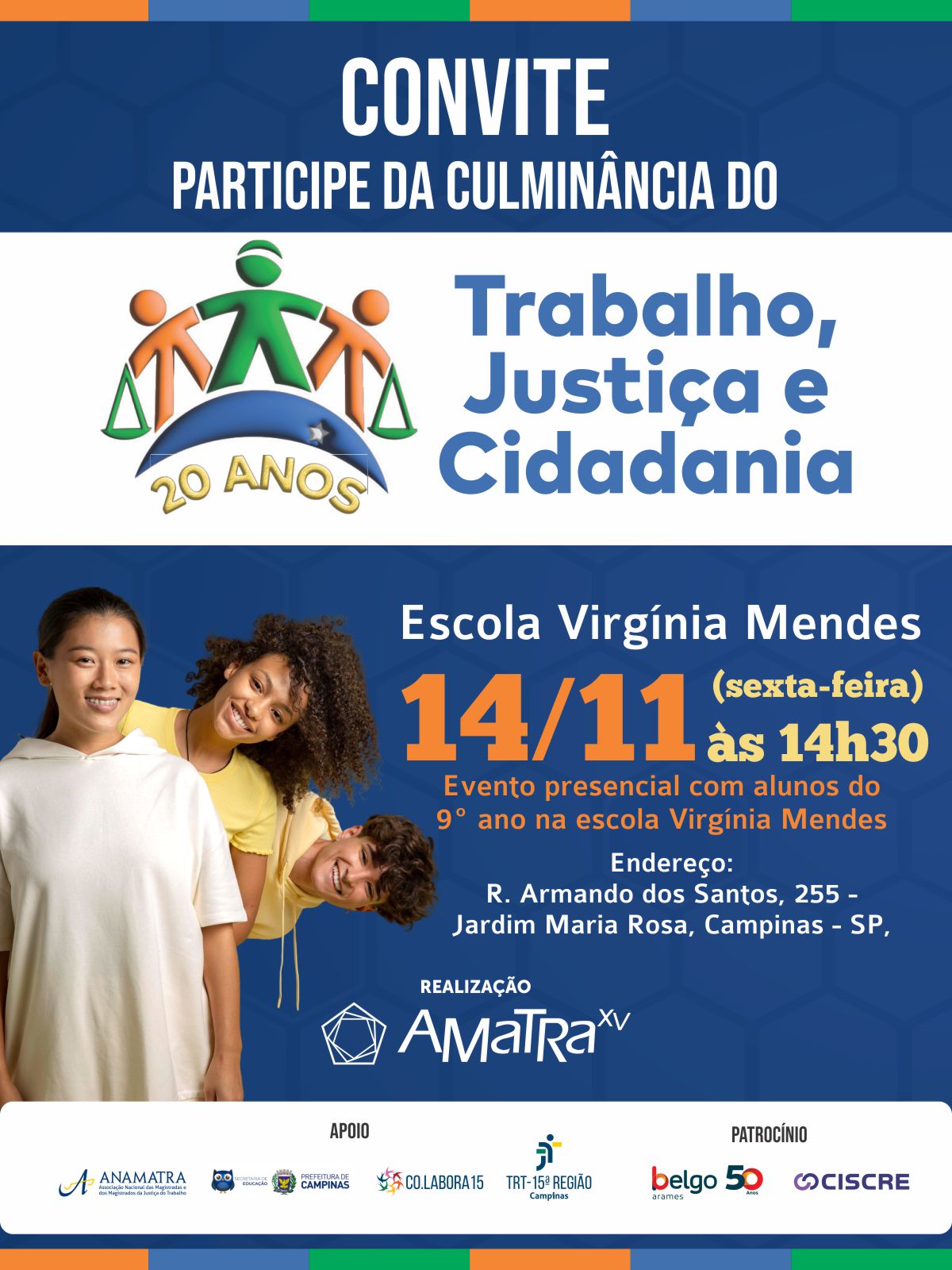 Tudo pronto para mais um evento de culminância do Programa Trabalho, Justiça e Cidadania (TJC), no âmbito da AMATRA XV. Desta vez, a atividade acontecerá nesta sexta-feira, 14/11, a partir das 14h30, na Escola Municipal de Ensino Fundamental “Virgínia Mendes”, de Campinas (SP).