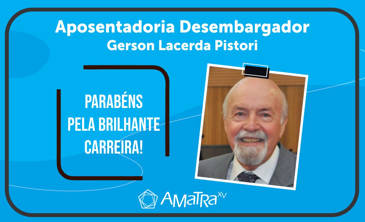 A AMATRA XV cumprimenta seu associado e ex-Presidente, o Desembargador Gerson Lacerda Pistori, pela aposentadoria publicada no Diário Oficial da União, com início em 16/09/2025.