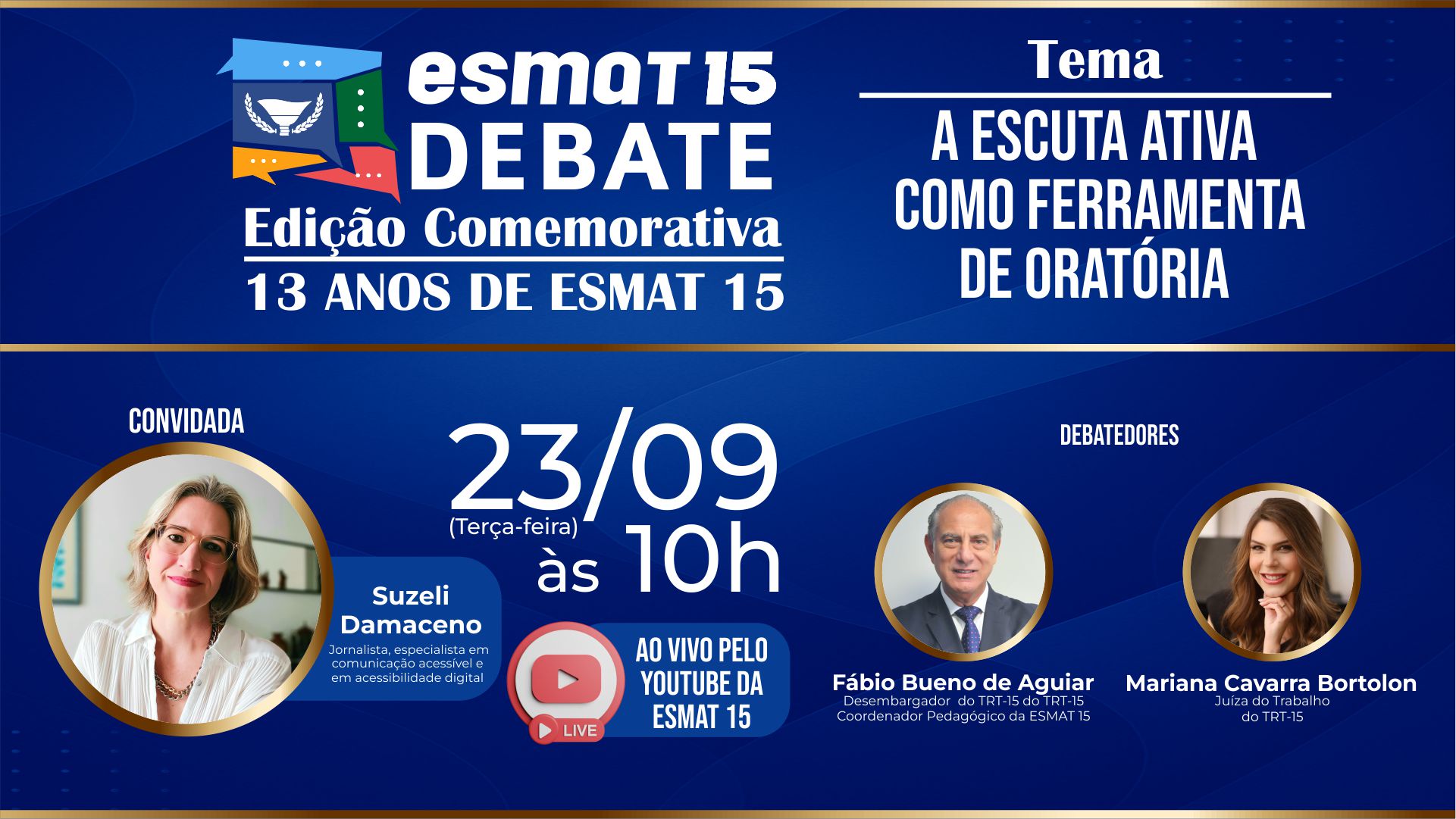 O tema será: “A escuta ativa como ferramenta de oratória”, com a convidada Suzeli Damaceno, jornalista, especialista em comunicação acessível e em acessibilidade digital.