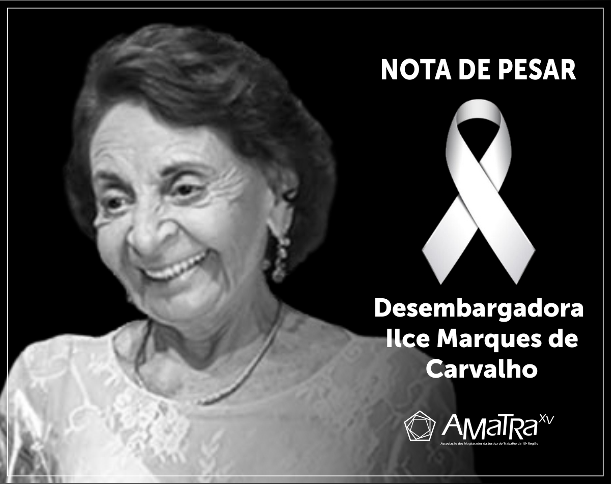 A Associação dos Magistrados da Justiça do Trabalho da 15ª Região - AMATRA XV lamenta o falecimento da Ex-Presidente da Associação Nacional dos Magistrados da Justiça do Trabalho - ANAMATRA, a Desembargadora Ilce Marques de Carvalho.