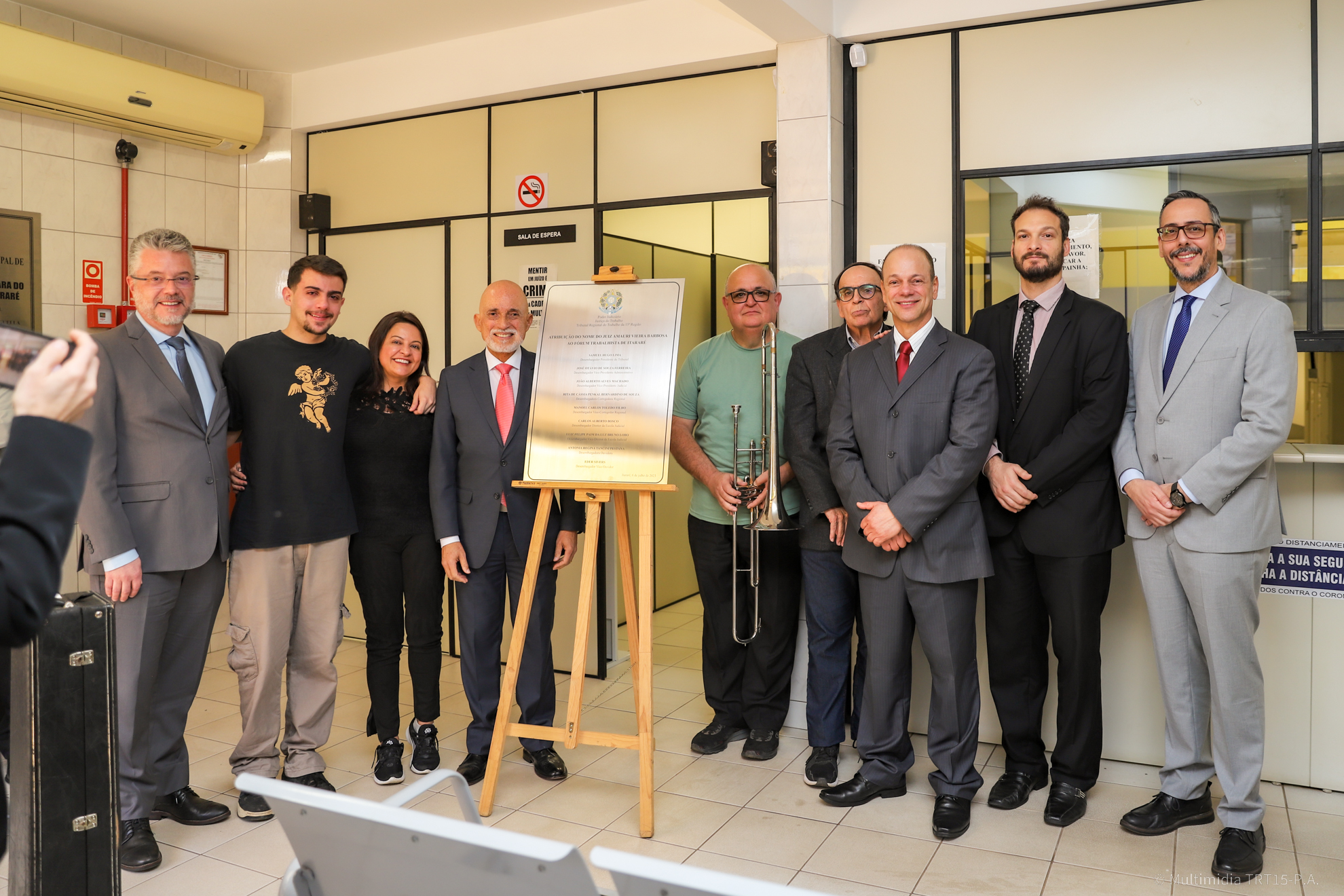 Durante a cerimônia realizada no Fórum de Itararé, o presidente Samuel Hugo Lima, ao lado da viúva do homenageado, Daniela Cristina Faria, do filho Henrique Ferrari de Albuquerque Barbosa e do irmão José Roberto Vieira Barbosa, realizou o descerramento da placa com a nova denominação do Fórum.