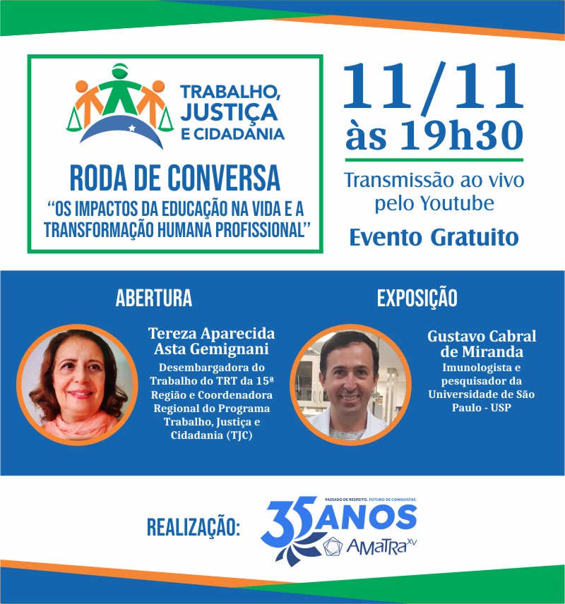 TJC-AMATRA XV: Roda de Conversa terá participação do Imunologista Gustavo Cabral de Miranda